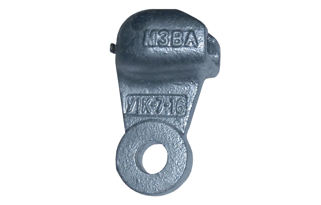 Для соединения стержня подвесного изолятора или серьги, при комплектовании изолирующей подвески, применяют ушки У1 и У1К. Размеры гнезда сферического шарнирного соединения ушек соответствуют требованиям ГОСТ 27396. Двухлапчатая проушина ушек, присоединяемая к арматуре, выполнена в соответствии с требованиями ГОСТ 11359. Для предотвращения разъединения стержня изолятора или стержня серьги ушки комплектуются W- образными замкам, выполненными по ГОСТ Р 51178. Ушки У1К имеет меньший габаритный размер чем ушки У1. Ушки У1К применяются в изолирующих подвесках и траверсах креплений без защитной арматуры. Их применение сокращает длину и массу подвески. Изготавливаются из конструкционной высокомарочной стали, которая обеспечивает высокие прочностные характеристики. В целях коррозионной защиты ушки покрываются горячим цинком по ГОСТ 9.307 или термодиффузионным цинкованием по ГОСТ Р 9.316. Изготавливаются по ТУ 3449-001-52819896-2010.