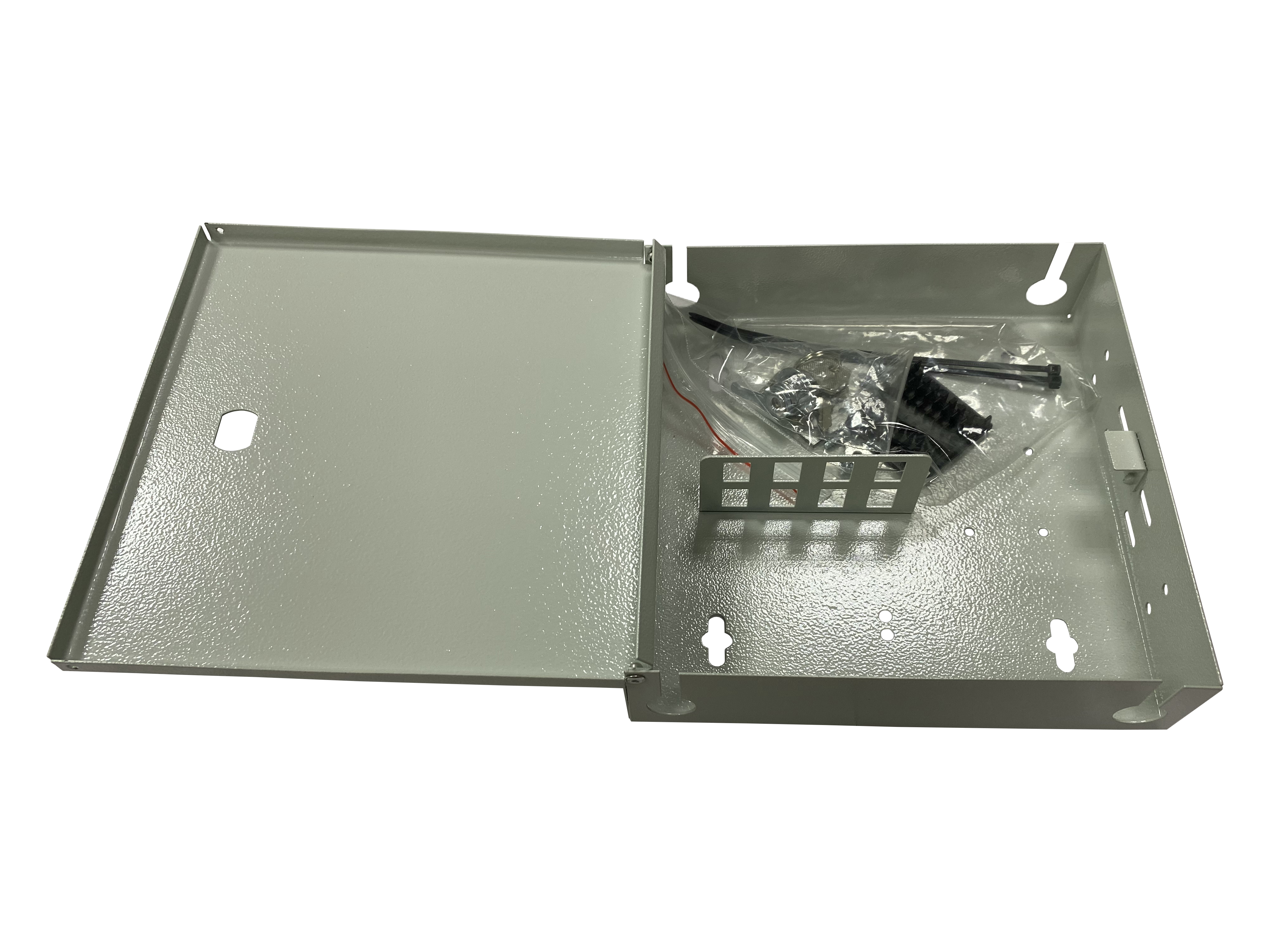 Представляет собой малогабаритный оптический бокс с распашной дверцей. Предназначен для установки на стену. Внутри кросса установлена малогабаритная сплайс-кассета для фиксации гильз КДЗС. Дверца без замка, фиксируется с помощью винтового барашка.